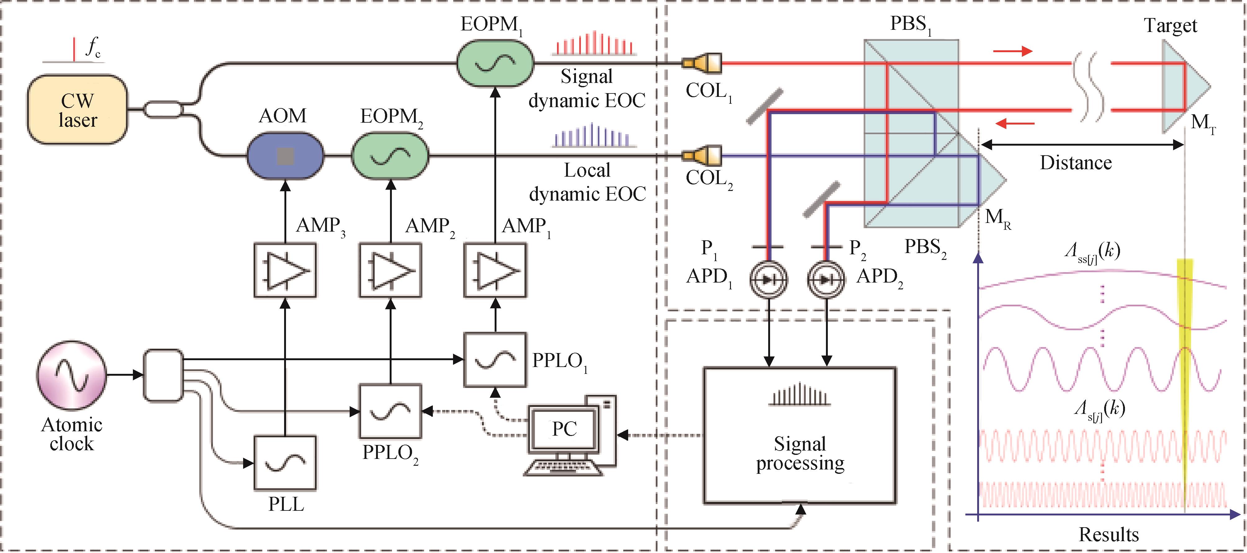 摘要:传统激光调频连续波测距技术多基于可调谐激光器或双光源架构实现,系统复杂、工程化难度高,且动态场景下存在误差放大现象。针对上述不足,本研究团队提出一种基于电光双边带调制的激光调频连续波测距方法,利用稳频激光器与电光调制器生成2路反向扫频信号,降低系统体积并减小动态误差;设计全相位快速傅里叶变换算法,实现高动态、高噪声条件下稳定可靠的相位解算;引入卡尔曼滤波优化动态状态估计,提高测距稳定性。实验结果表明:在接入20 m光纤的条件下,该方法的绝对距离测量误差不超过± 20 μm;在振幅 ≤ 500 nm、频率 ≤ 200 Hz的条件下,正弦振动目标相对位移测量误差不超过± 25 nm,验证了该方法的高可靠性,为推动激光调频连续波测距技术的工程化应用提供了有力支撑。