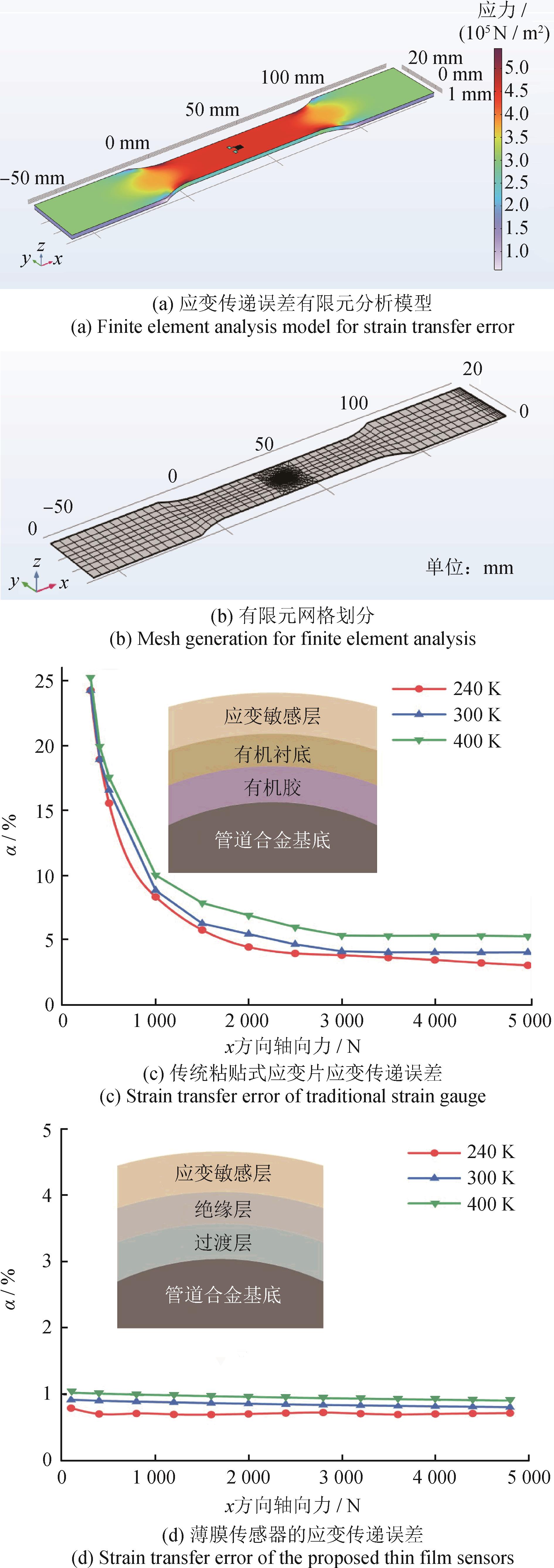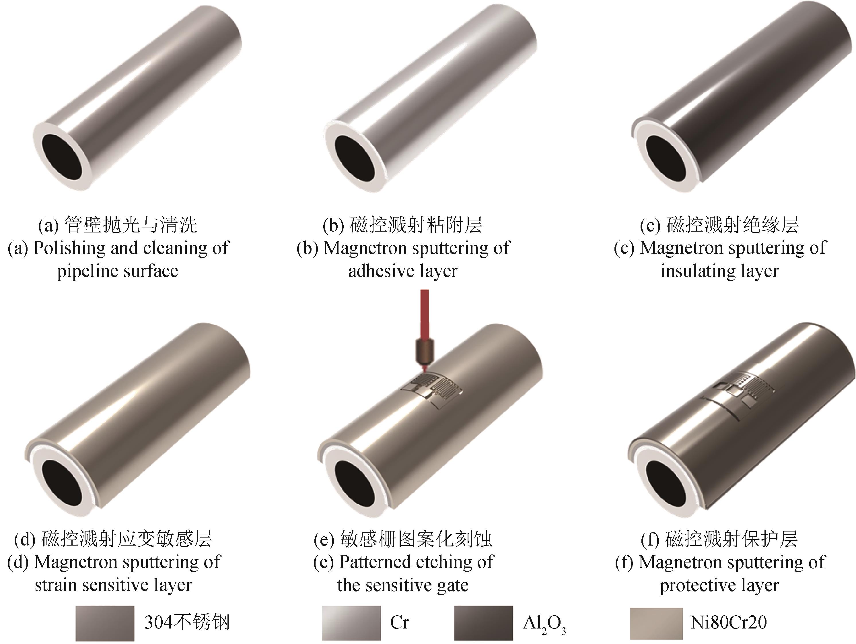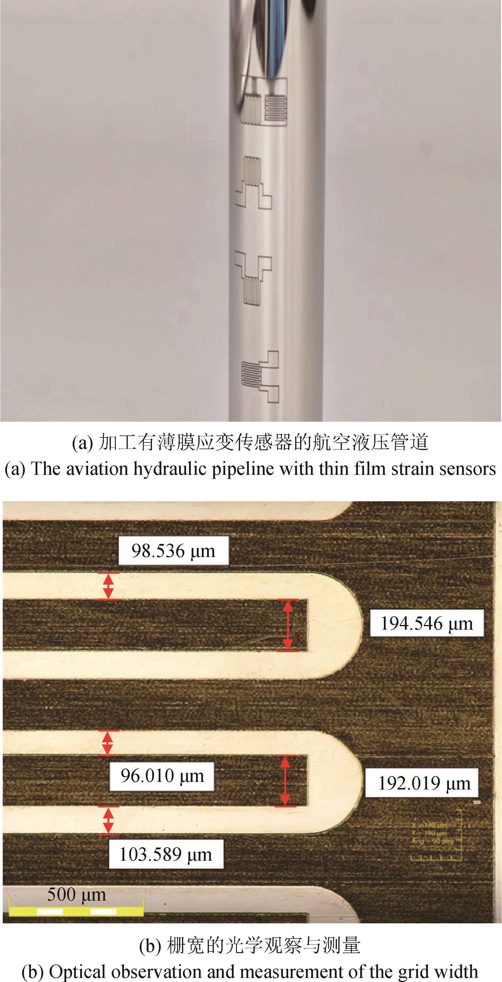 Abstract:Traditional strain gauges face challenges such as significant strain transfer errors and slow response during monitoring, severely limiting the engineering effectiveness. To addresses the monitoring requirements for strain, vibration, and clamp looseness in aviation hydraulic pipelines, this paper proposed a design and manufacturing method for in?situ preparation of thin?film strain sensors on hydraulic pipelines. A finite element analysis model for strain transfer errors was established, and the structural parameters of the resistive strain grating were optimized. Multi?layer hetero?thin films, including the Ni80Cr20 strain?sensitive layer, were prepared using magnetron sputtering technology. Through a five?axis laser etching process, the laser incidence angle and focal position were adjusted in real?time, achieving a high?precision control over the etching depth. Testing revealed that the prepared thin?film strain sensor exhibited a drift rate (DR) of 8.4 × 10-5 h-1, a temperature coefficient of resistance (TCR) of 1.3 × 10-4 ℃-1 in the range of -40 ~ 100 ℃, a gauge factor (GF) of 2.03 in the strain range of 0 ~ 500 με, and a response time of just 15 ns. Force hammer experiments confirmed the sensor's ability to detect and identify key information such as strain, vibration, and clamp tightness. This integrated manufacturing sensor holds promising applications in the field of aviation hydraulic pipeline condition monitoring.